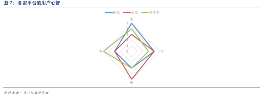 从多、快、好、省角度来看,用户对阿里、京东(JD.US)和拼多多的感受各不相同:淘宝天猫的优势是多、好;京东的优势是快、好;拼多多的优势是省。