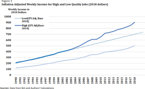 到目前为止,研究人员发现情况不妙。从“生产和非监督”职位(主要是中产阶级职位)来看,在1990年至2018年之间,低工资/低小时工作与高薪/高小时工作之间的差距经通胀调整后的工资差距扩大了近四倍。