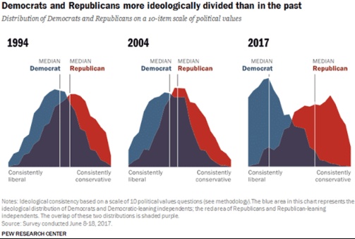 问题在于,本世纪中产阶级民主党人和共和党人之间的意识形态鸿沟已经扩大为巨大的鸿沟。直到2004年,山形分布之间只有很小的倾角,现在看起来就像是一个火山口。