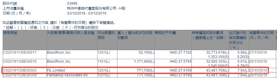 智通财经APP获悉,港交所最新资料显示,11月26日,富达国际减持中车时代电气(03898)77.17万股,每股作价27.6166港元,总金额约为2131.18万港元。减持后最新持股数目为4348.18万股,最新持股比例为7.94%。