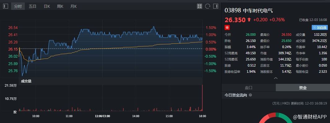 截至今日收盘,中车时代电气(03898)涨0.76%,报26.35港元。
