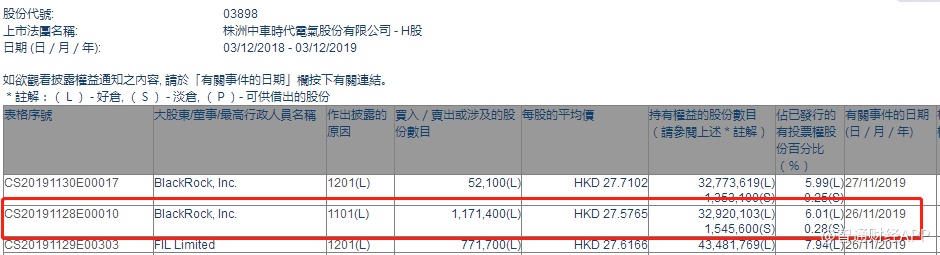 智通财经APP获悉,港交所最新资料显示,11月26日,贝莱德增持中车时代电气(03898)117.14万股,每股作价27.5765港元,总金额约为3230.31万港元。增持后最新持股数目为3292.01万股,最新持股比例为6.01%。