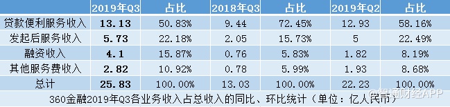 从业务构成来看,以表内资产进行助贷业务的融资收入增长最快。2018年第三季度时,该业务收入占比仅5.83%,但至2019年第三季度时,占比已提升至15.87%,同比增长10个百分点。融资收入利润相对较高,360金融也有动力将资源向融资收入业务上倾斜。