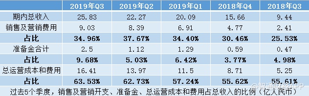 智通财经APP发现,导致运营利润率产生较大变化的主要原因是销售及营销费用,以及准备金。销售及营销费用占比从2018年第三季度的25.53%提升至34.96%,增长近10个百分点,这主要是因为获客成本的不断上升。
