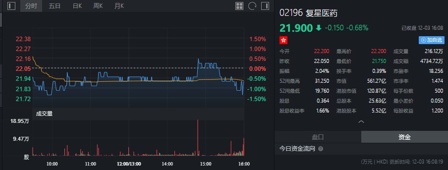 截至今日收盘,复星医药(02196)跌0.68%,报21.港元。