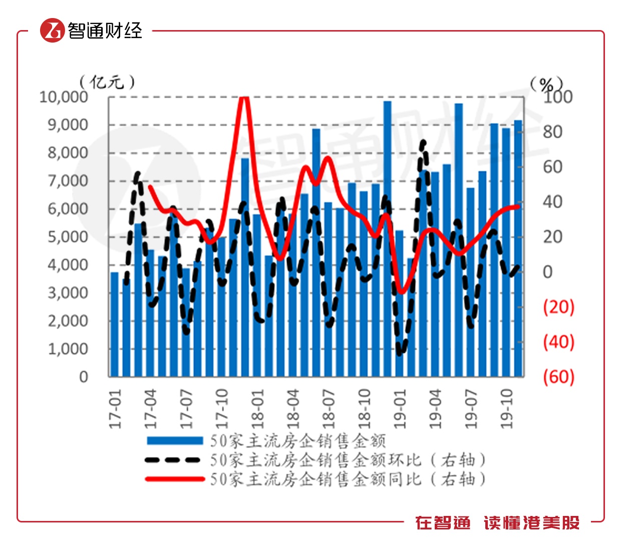 主流50家房企11月销售表现大幅超出市场预期,同比涨幅已经实现连续5个月扩大。智通财经APP了解到,克而瑞近期发布了2019年11月房地产公司销售数据排行,首先就整体而言,主流50家房企11月单月销售额达到9177亿元人民币(单位下同),环比增长3%,同比增幅较上月提升1个百分点至37%,销售增速实现连续5个月的扩大;单月销售面积达到6841万平米,环比增长1%,同比增幅同样提升1个百分点至38%。主流50家房企前11月累计销售金额达8.16万亿元,累计销售面积达6.02亿平米,同比增速均为17%,较前值分别上升1和2个百分点。
