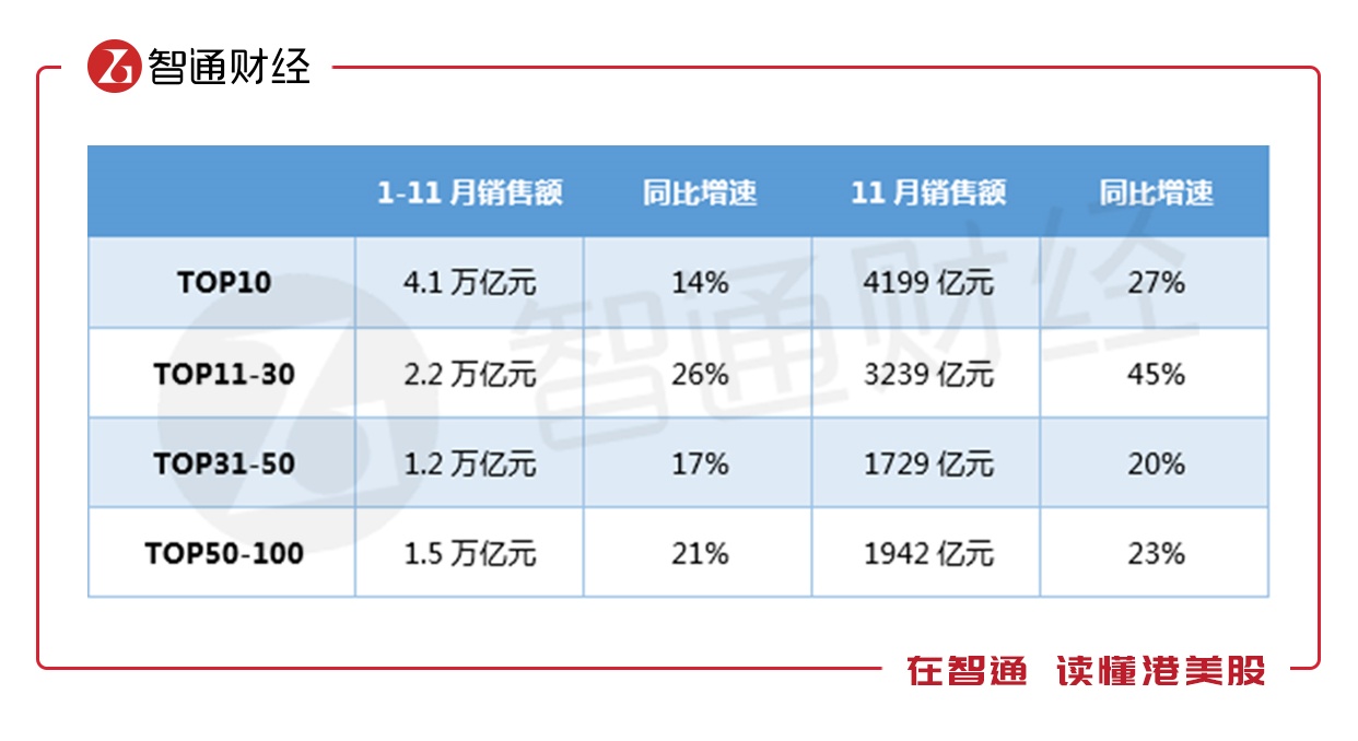 分梯队来看,房企销售额实现全面增长,其中又以第二梯队的中等规模房企增速最为亮眼。智通财经APP了解到,从1-11月累计销售金额排名来看,top10、top11-30、top31-50、top51-100销售金额分别为4.1、2.2、1.2、1.5万亿元,分别实现同比增长14%、26%、17%、21%。而11月单月销售情况方面,top10、top11-30、top31-50、top51-100销售金额分别4199、3239、1729、1942亿元,同比增长分别达到27%、+45%、+20%、+23%。其中top11-30的二梯队房企,无论是总金额26%的增速还是单月45%的同比增速,均是各梯队房企中遥遥领先的,而top10的头部房企11月份27%的同比增速已升至第二,有加速提升的态势。