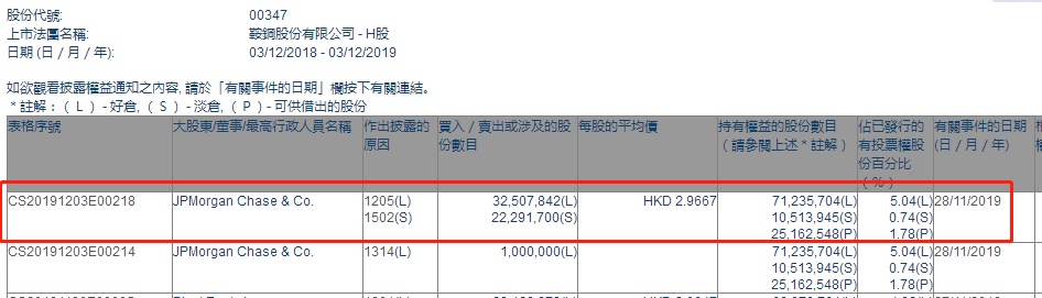 智通财经APP获悉,港交所最新资料显示,11月28日,摩根大通减持鞍钢股份(00347)3250.78万股,每股作价2.9667港元,总金额约为9644.09万港元。减持后最新持股数目为7123.57万股,最新持股比例为5.04%。