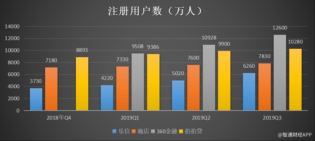 从Q3来看,乐信用户数达到6260万,比去年同期3260万增长92.2%,创造单季用户增量新高;360金融累计注册用户数1.26亿元,同比增长90%,增速居之第二;拍拍贷注册用户达到1.028亿,同比增长22.51%;趣店截至三季度末累计注册用户数增长至7830万,但相比去年同期仅增长11.85%。