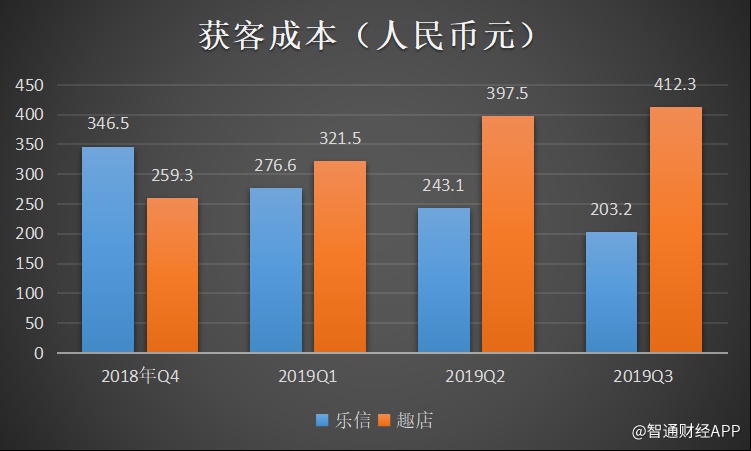 从上图来看,乐信的获客成本在近4个季度持续下降,从2018年Q4的346.5元/人,下降到今年Q3的203.2元/人。作为比较,获客相对激进的360金融,获客成本从2018年Q4的259.3元/人上升至Q2的397.5元/人,而趣店更上升至412.3元。