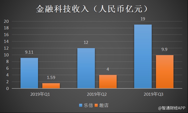 两者均在三季度实现了金融科技收入环比飙升:第三季度,乐信通过为各类金融机构服务获得的金融科技收入达到19亿元,环比二季度的12亿元大增58.33%;趣店的开放平台业务则延续强劲增长势头,第三季度开放平台业务实现收入9.9亿元,环比第二季度大幅增长150%。