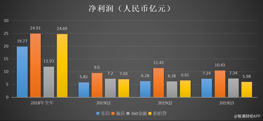 根据各家披露的财务数据看,2019Q3,非美国通用会计准则下,乐信净利润为7.24亿元,同比增长62%;趣店净利润为10.434亿,同比增长52.6%;拍拍贷净利润为5.985亿元,同比下滑7.9%;360金融净利润为7.34亿元,同比增长27%。