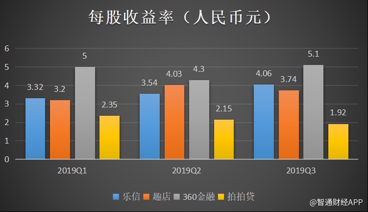 每股收益方面,360金融始终保持着每股最高的收益率,但中间有起伏,从Q1到Q3基本没增长;拍拍贷一直在下滑,趣店在Q3开始滑落,则乐信成为其中亮点——一直呈增长状态。