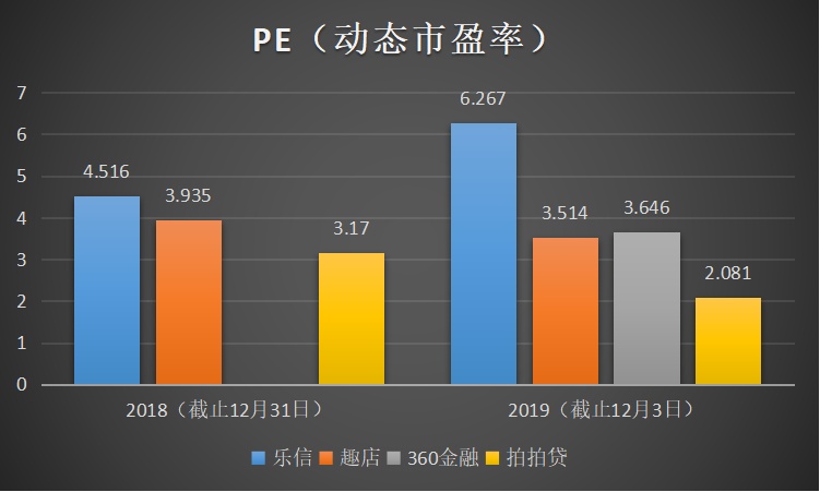 由于360金融是2018年底上市,缺乏同期相比数据,故此2018年的PE值仅有趣店、乐信和拍拍贷三家作为比较。