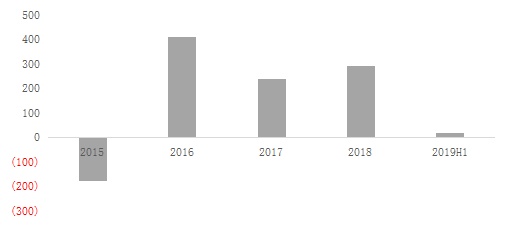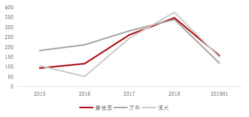 图表:2015-2019H1碧桂园经营性现金流净额(亿元)