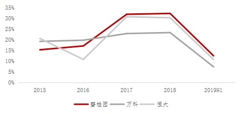 自2017年碧桂园摘取行业第一的销售桂冠后,企业连年保持销售规模增长,成为名副其实的行业龙头,这一阶段主要受益三四线红利影响,并且在三四线城市中优渥的土地为公司提供了充分的盈利空间。当前,碧桂园依然能保持较高的利润率水平,除了早先储备价格低廉的土地外,更依赖于公司的精准拿地。这个时期,碧桂园从规模之王逐渐向利润之王转变。根据碧万恒历年归母净利润变动,2019年中期碧桂园实现归母净利润156.4亿元,超过万科和恒大。从企业ROE水平来看,碧桂园从2017年起便保持着优势,2019年中期ROE达到12.4%。