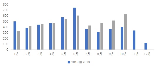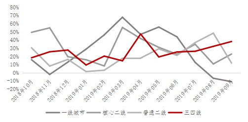 2018年初,一二线核心城市在政策的强调控下,成交量率先开始萎缩,一线城市和一些核心二线城市均出现不同的下降。2019年初,尤其是在2月份之后,这些城市的成交量开始回暖,我们认为这一阶段一二线核心城市成交的回暖只是反弹,而不会形成长期的趋势,成交难以反转。然后在5、6月份之后,这类城市成交量同比逐步下滑,尤其是一线城市在8、9月份的成交量下滑严重。