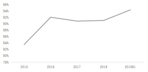 自2016年起,碧桂园的销售回款率便保持在90%以上,并稳中有升,2019年中期更是达到94.3%。得益于较高的销售回款率,公司经营性现金流净额从2016年开始一直保持正数,现金流压力不大。不过值得注意的是,在当前的融资环境下,企业通过外部融资方式的资金流入在减少,并且成本在提升。但是根据我们做过的企业现金流压力测试来看,大型房企尤其是类似碧桂园这样的企业,即使融资全面停止,仅依靠自身超过90%的回款率就能满足公司经营开支。