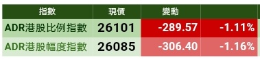 智通财经APP获悉,12月3日,美股大幅受压,拖累港股ADR指数全日急跌,按比例计算,收报26101点,跌289.57点或1.11%。大型蓝筹全线下挫,汇丰控股收报56.89元,较港收市跌1.06元;腾讯控股收报326.43元,较港收市跌4.57元。