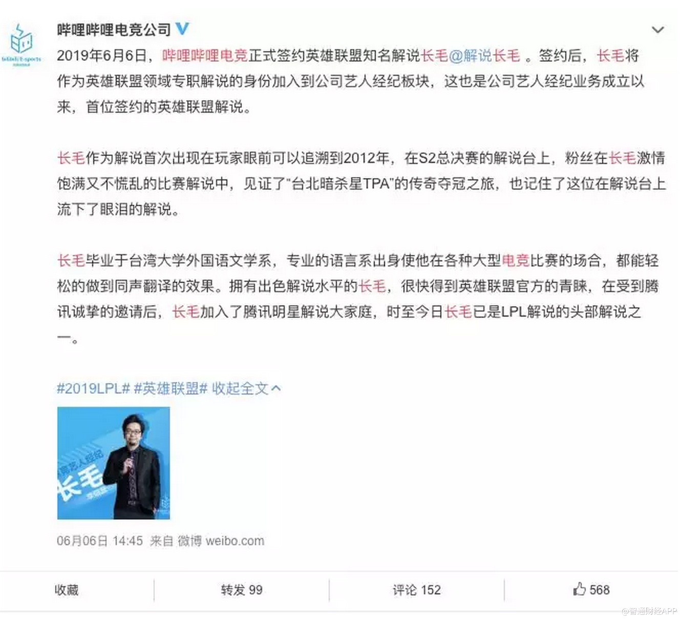 B站更是在2017年底就通过收购IM战队获得LPL(中国《英雄联盟》职业联赛)席位,并以此IM的班底创建BLG战队征战多个电竞赛事。2018年1月,B站取得LPL、洲际赛、全球总决赛等LOL顶级赛事直播权。2019年6月,B站电竞公司还签下了给LOL研发公司RiotGames做了四年官方解说的长毛。(编辑:唐梦婕)