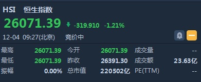 智通财经APP获悉,恒生指数开盘低开319.91点或1.21%,报26071.39点。国企指数跌0.98%,报10254.91点。红筹指数跌1.09%,报4190.56点。大市盘前成交23.63亿港元。