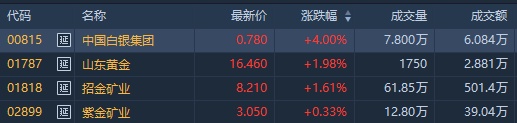 截至发稿,中国白银集团(00815)涨8%,报0.81港元;招金矿业(01818)涨2.97%,报8.32港元;山东黄金(01787)涨2.23%,报16.5港元;中国黄金国际(02099)涨1.61%,报6.31港元。