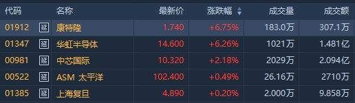 截至发稿,康特隆(01912)涨6.75%,报1.74港元;华虹半导体(01347)涨6.7%,报14.66港元;中芯国际(00981)涨1.98%,报10.3港元;ASM太平洋(00522)涨0.79%,报102.7港元。