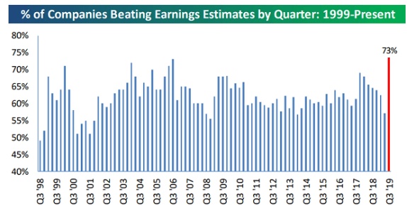 众所周知,即将公布的财报好于预期是推高股价的主要原因之一。FactSet指出,“今年第三季度,有73%的公司公布的实际每股盈余高于平均预期的每股盈余……该比例高于5年(72%)平均水平。”