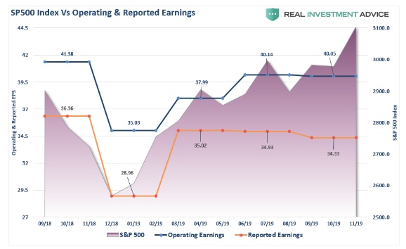 在2019年第三季度,市场预期的季度营业利润从40.14美元下滑0.25%至40.05美元。尽管营业利润对于分析完全没有用,因为这个数据大部分是捏造的,且已将表现不佳的部分剔除了。实际公布的盈利则从34.93美元下滑1.75%至34.33美元。