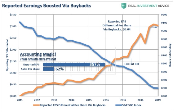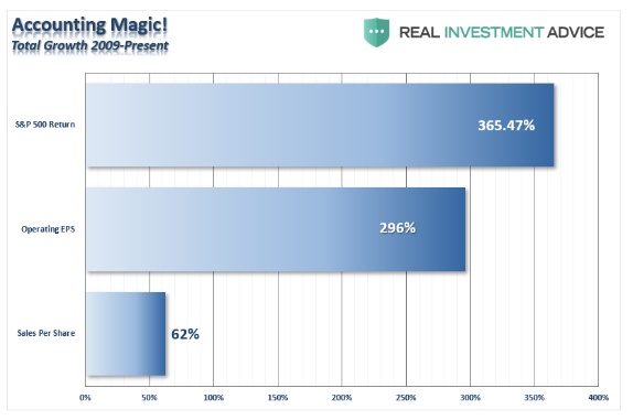 “企业花费数十亿美元回购股票是为了提高每股盈利,这给人一种盈利能力不断提高的错觉,从而支撑股价上涨。自金融危机以来,企业营收增长仍然极其疲软,开始依赖于通过减少分母来夸大每股收益。如下图所示,自2009年初以来,每股收益增长超360%,而营收增长则不超过50%。”