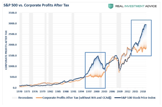 因预期能够达成贸易协议,以及美联储持续“放鸽”,市场在2019年出现大幅上涨。但与基本面严重背离,达到了只有在前几个市场周期见顶时才会出现的极端状况。