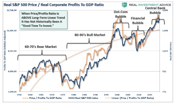 由于企业利润增长是经济长期增长的组成部分,我们也可以看到市场相对于企业利润增长(占经济增长的百分比)有多“昂贵”。我们再次发现,当价格与利润之比高于长期线性趋势时,市场就会陷入困境,并最终经历更为严重的均值回归。随着价格与利润之比再次升至长期趋势上方,几乎没有迹象表明,市场尚未消化未来经济和利润增长的良好前景。