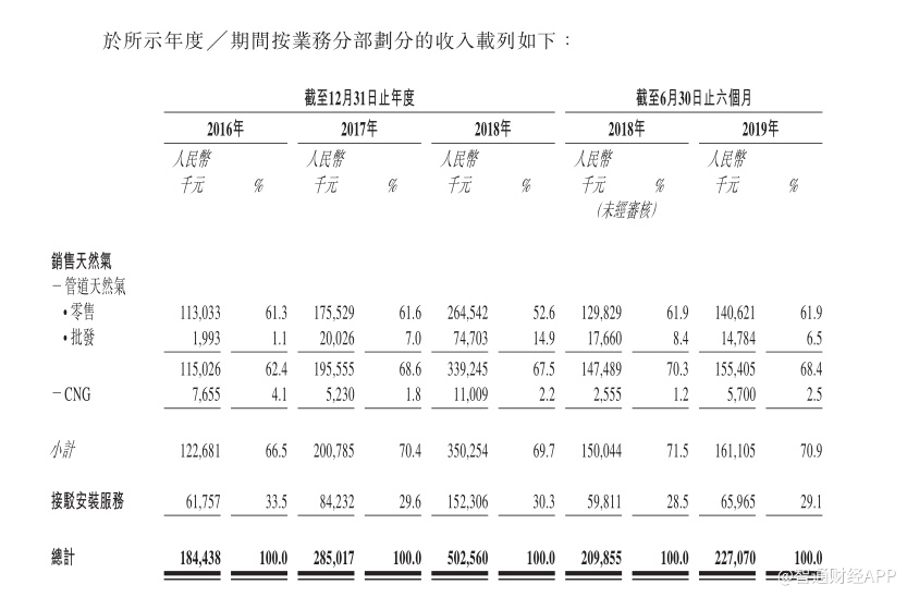 其次是接驳安装服务为汇名天然气的第二大业务。财报显示,2016-2018年,该业务实现营业收入分别为6176万元、8423万元和1.52亿元,于总收入的占比分别为33.5%、29.6%和30.3%。据智通财经APP了解,汇名天然气的接驳安装服务收入主要取决于其承接的项目数量及规模,过去三年收入增长迅速,主要是进行武邑天然气村村通工程1号和深州天然气村村通工程的接驳安装。