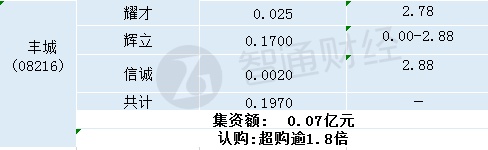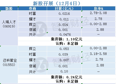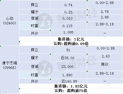 智通财经APP获悉,12月4日,人瑞人才(06919) 、迈科管业(01553)、心动(02400)、康宁杰瑞(09966) 、丰城控股(08216)正在招股中。其中,康宁杰瑞超购逾75倍,丰城控股超购逾1.8倍,心动公司超购逾0.09倍,其它两家均未足额。
