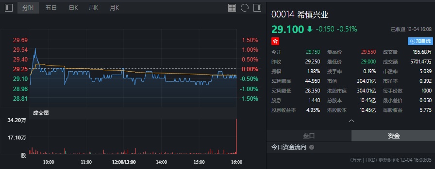 截至今日收盘,希慎兴业(00014)跌0.51%,报29.10港元。