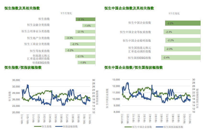 其他方面,在恒生综合指数的行业指数中,资讯科技业表现较佳(3.5%)而电讯业则连续两个月表现较差(-7.7%)。反映A股蓝筹股整体表现的恒生A股100强指数,在十一月滑落了1.4%。防守性策略表现较理想,恒生高股息率指数在十一月录得1.1%的涨幅。