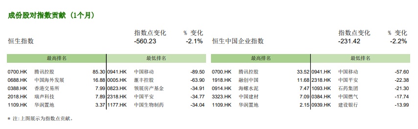 过去一个月中,恒生指数跌560.23个点。本月对恒指上涨影响最大的公司为腾讯控股(00700),其贡献点数85.30。对恒指下跌影响最大的公司为中国移动(00941),贡献了-89.50点。