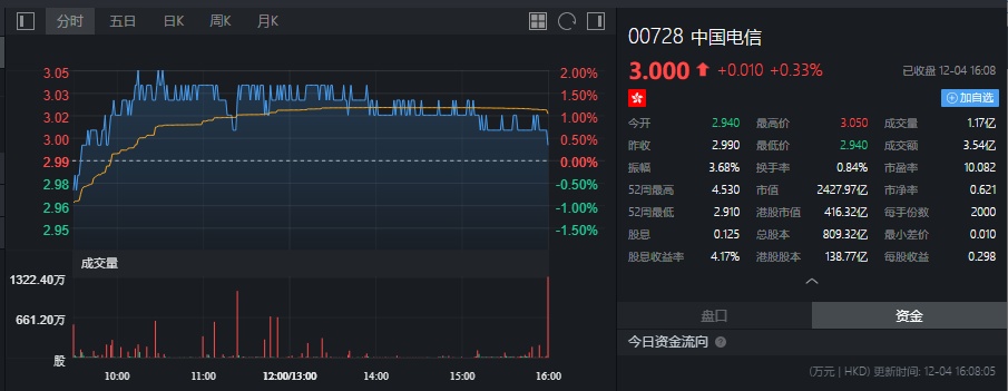 截至今日收盘,中国电信(00728)涨0.33%,报3.00港元。
