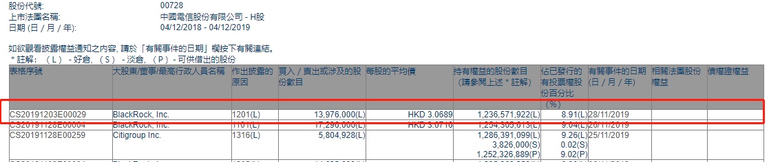 智通财经APP获悉,港交所最新资料显示,11月28日,贝莱德减持中国电信(00728)1397.6万股,每股作价3.0689港元,总金额约为4289.09万港元。减持后最新持股数目为12.37亿股,最新持股比例为8.91%。