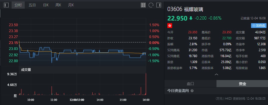 截至今日收盘,福耀玻璃(03606)跌0.86%,报22.95港元。