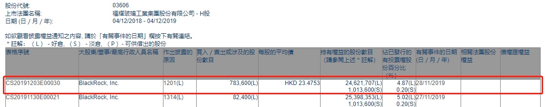 智通财经APP获悉,港交所最新资料显示,11月28日,贝莱德减持福耀玻璃(03606)78.36万股,每股作价23.4753港元,总金额约为1839.52万港元。减持后最新持股数目为2462.17万股,最新持股比例为4.87%。