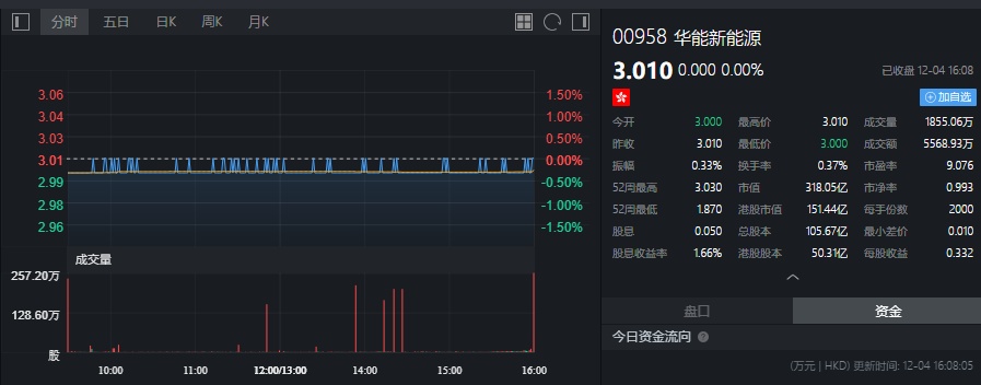 截至今日收盘,华能新能源(00958)无涨跌,报3.01港元。