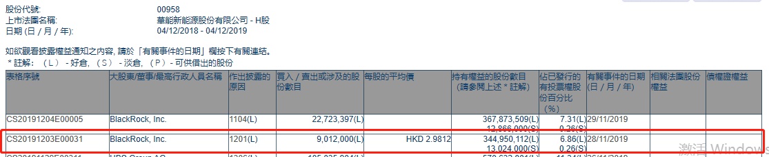 智通财经APP获悉,港交所最新资料显示,11月28日,贝莱德减持华能新能源(00958)901.2万股,每股作价2.9812港元,总金额约为2686.66万港元。减持后最新持股数目为3.45亿股,最新持股比例为6.86%。