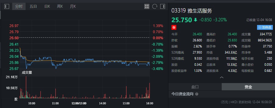 截至今日收盘,雅生活服务(03319)跌3.20%,报25.75港元。