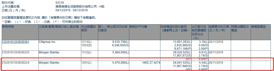 智通财经APP获悉,港交所最新资料显示,11月28日,摩根士丹利减持雅生活服务(03319)约547.9万股,每股作价27.4274港元,总金额约为1.50亿港元。减持后最新持股数目为2404.15万股,最新持股比例为5.54%。