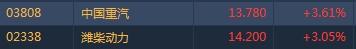 智通财经APP获悉,11月重卡销量同比增长5.3%约9.4万辆,全年销量或有望冲新高。重卡概念股集体走高,截至10时33分,中国重汽(03808)涨3.61%,报价13.78港元,潍柴动力(02338)涨3.05%,报14.2港元。