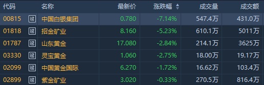 截至发稿,中国白银集团(00815)跌8.33%,报0.77港元;山东黄金(01787)跌2.73%,报17.1港元;中国黄金国际(02099)跌1.41%,报6.29港元。