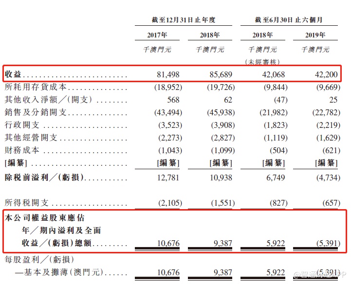 截至2017年及2018年12月31日止年度、及截至2018年及2019年6月30日止六个月,集团的收益分别约为8150万、8570万、4210万、及4220万澳门元,其中主品牌为集团带来的绝大部分收益,分别占总收益的91%、92.1%、92%、及93%。同期,集团净利润分别为1068万、939万、592万、-539万澳门元。