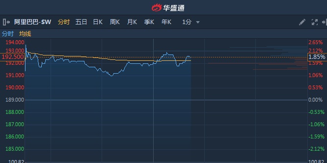 智通财经APP获悉,阿里巴巴-SW(09988)获高盛及富瑞唱好,利好消息刺激下,该股盘中一度涨超2%,截至13时43分,涨1.85%,报价192.5港元,成交额21.4亿。