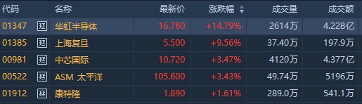 截至发稿,华虹半导体(01347)涨14.79%,报16.76港元;上海复旦(01385)涨8.76%,报5.46港元;ASM太平洋(00522)涨3.33%,报105.5港元;康特隆(01912)涨2.15%,报1.9港元。